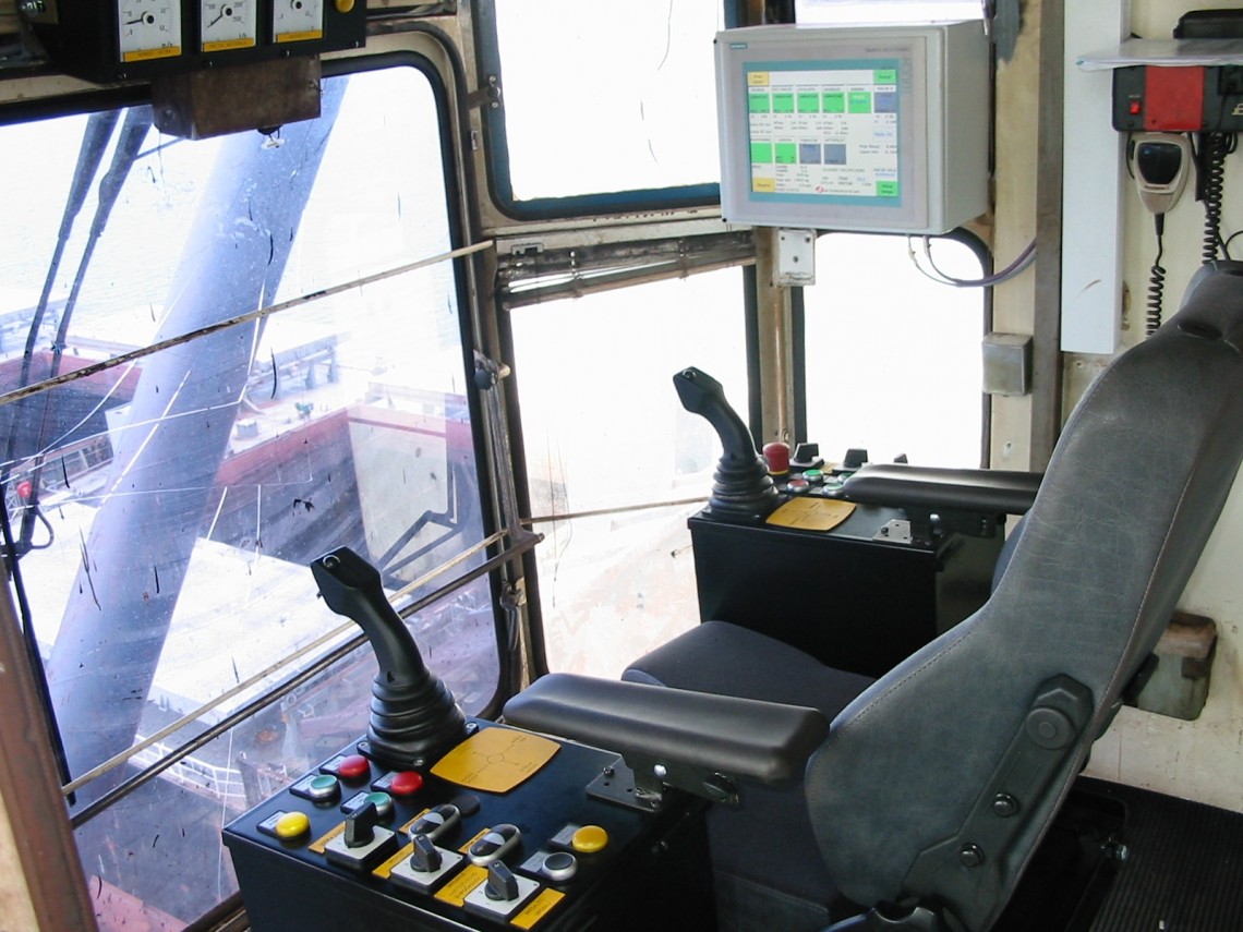 When renovating the bridge crane the entire electrical equipment was replaced. Control of the machine is done with SIEMENS control equipment. Control and management of the maschine is carried out in the cabine where the machine operator operates via the control panel and control stick.