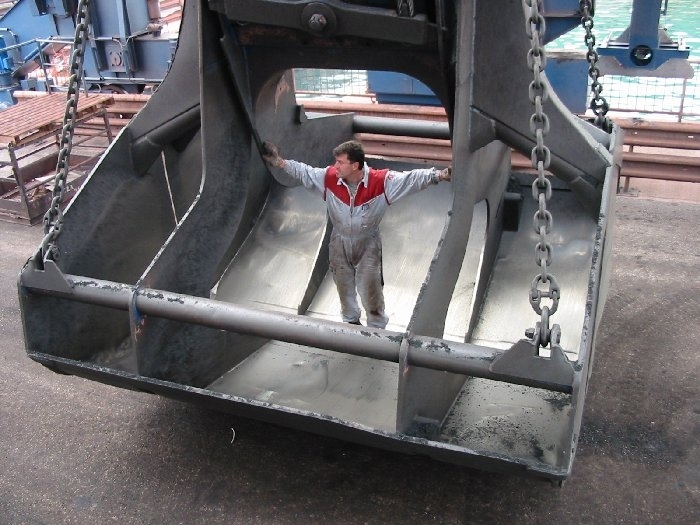 Mostno dvigalo z grabilcem zagrabi razsuti tovor v ladji in ga prestavi v svoj bunker na obali. Naenkrat grabilec zagrabi tudi do 40 ton tovora.
